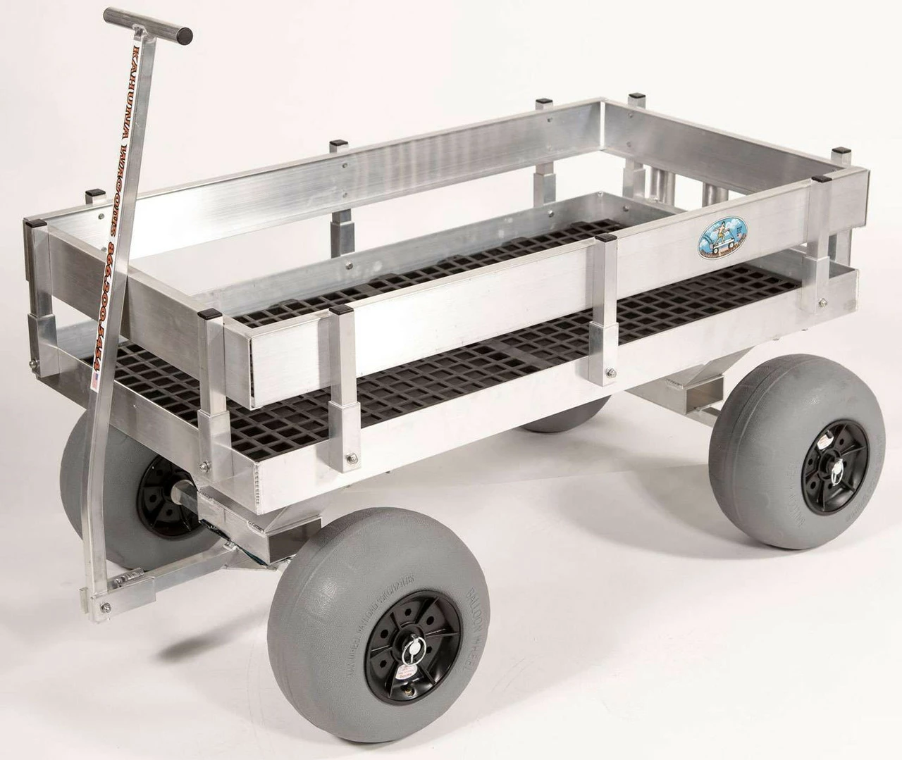 The Alumacart Big Kahuna Beach Wagon w/UV Decking features a UV protected polypropylene deck that allows for sand and water to easily fall through the wagon bed. This wagon features reinforced and raised undercarriages, aluminum four-rod holder bolted to the aluminum deck with stainless steel hardware, aluminum wagon walls to protect your cargo from falling out of the wagon, (4) 11.8” low PSI balloon tires, and a pull handle.