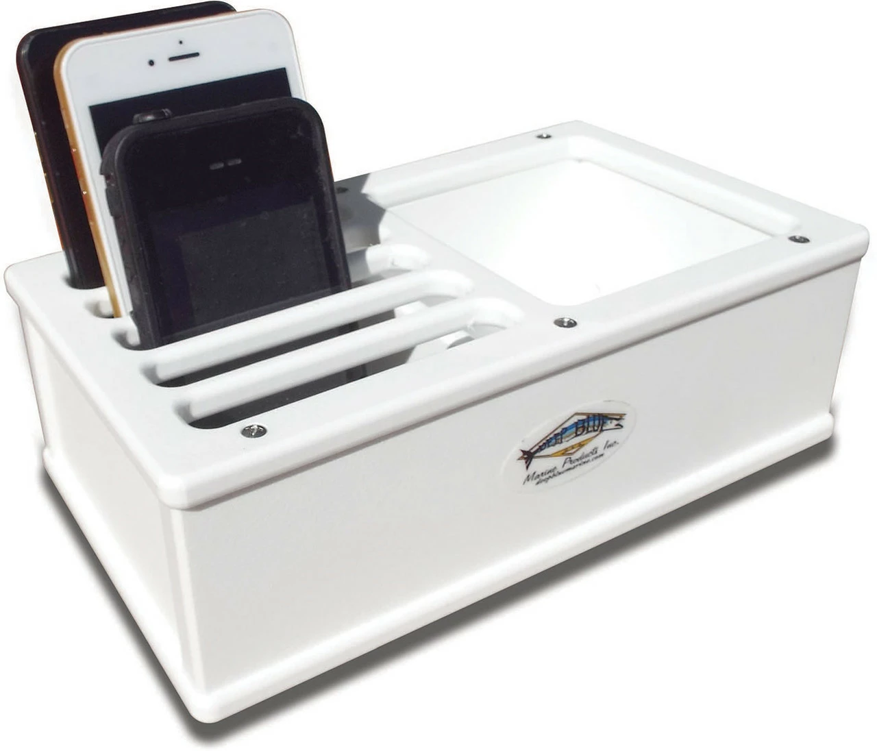 The Deep Blue Cell Phone Storage Box has five cell phone slots as well as a storage box for any other loose items, wallets, keys, sunscreen, etc. Made out of Starboard, so it won’t warp or fade from the sun. Can be mounted permanently or with suction cups (included). Lifetime warranty, Made in America, Tested on the water.