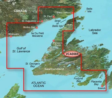 Garmin BlueChart g2 Vision Newfoundland West SD Card: Chart VCA008R – Newfoundland West covers the western and southern coast of New Foundland from the Strait of Belle Isle to Placentia Bay, including St. George’s Bay and Fortune Bay. Also covers the coasts of Quebec and Labrador from La Romaine to Red Bay.