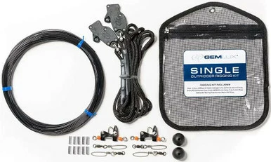 The Gemlux Single Outrigger Rigging Kit has everything you need to set up a single outrigger for trolling. This kit consistis of 50yd of 400lb UV Stable Outrigger Line (enough to rig 2 poles) in either black or white, 2.0mm Aluminum, Blacks Release Clips, Blacks Ball Stops, 200lb Ball Bearing Snap Swivels, and a Single GEMLOX with Heavy Duty Custom Rope.