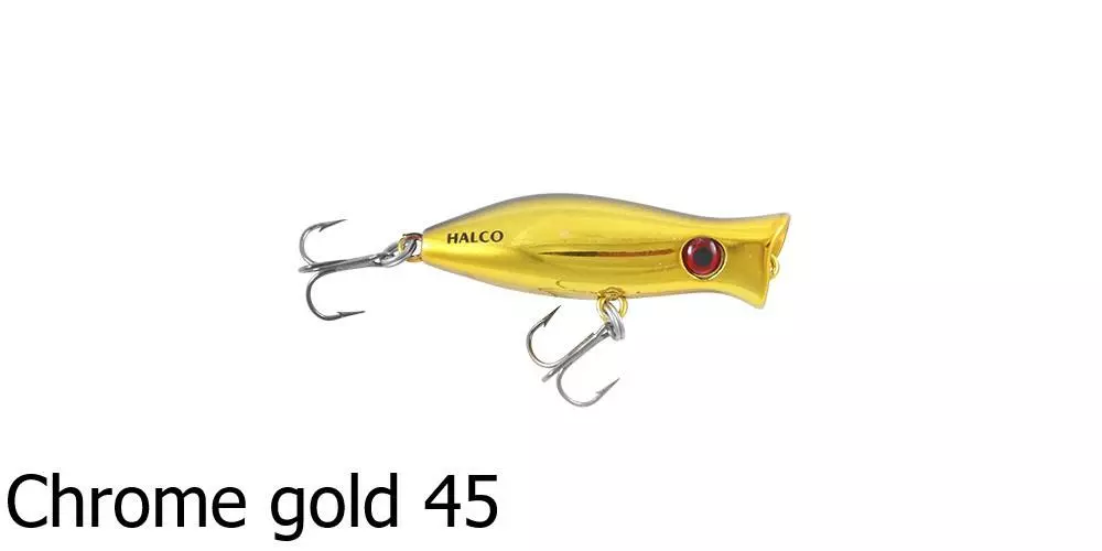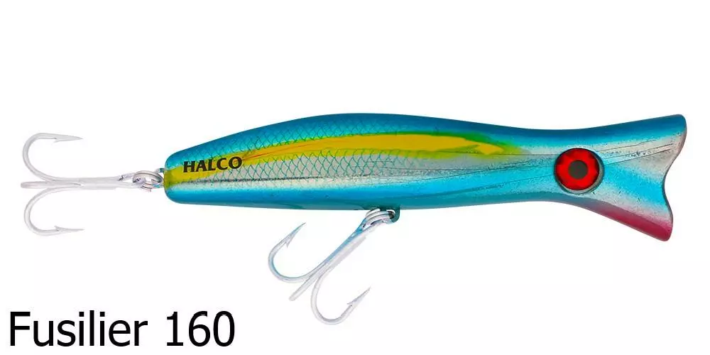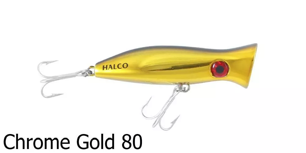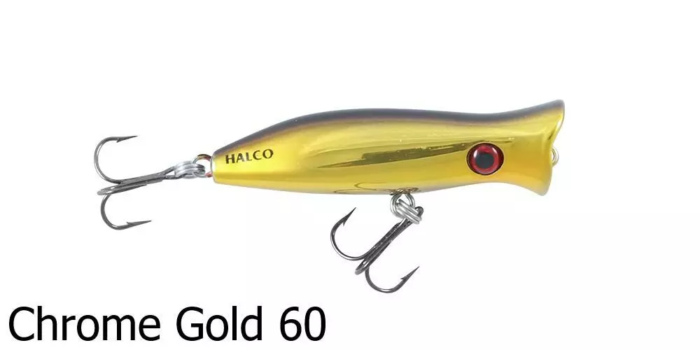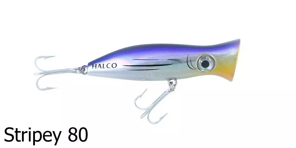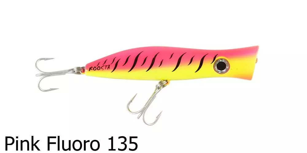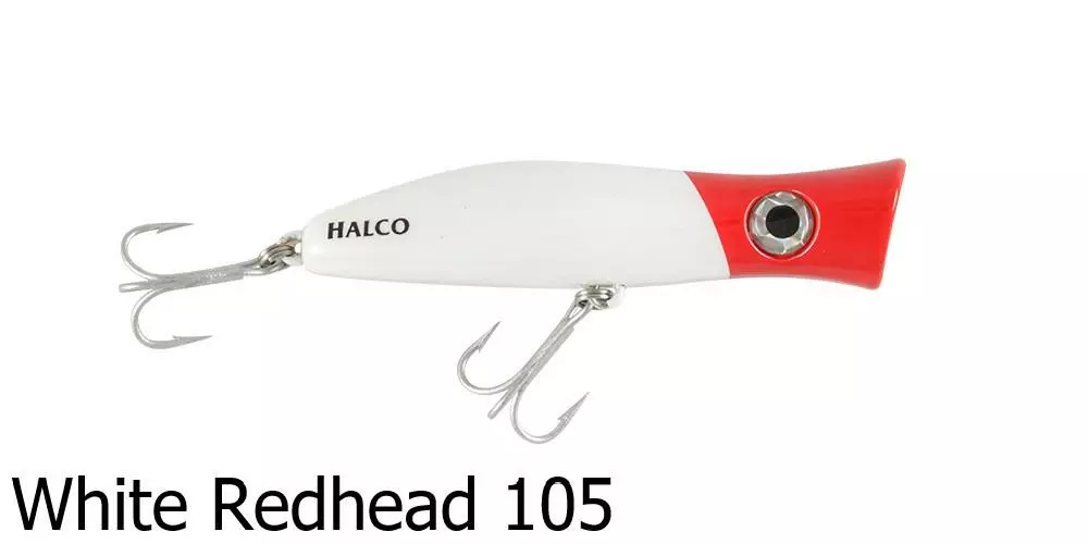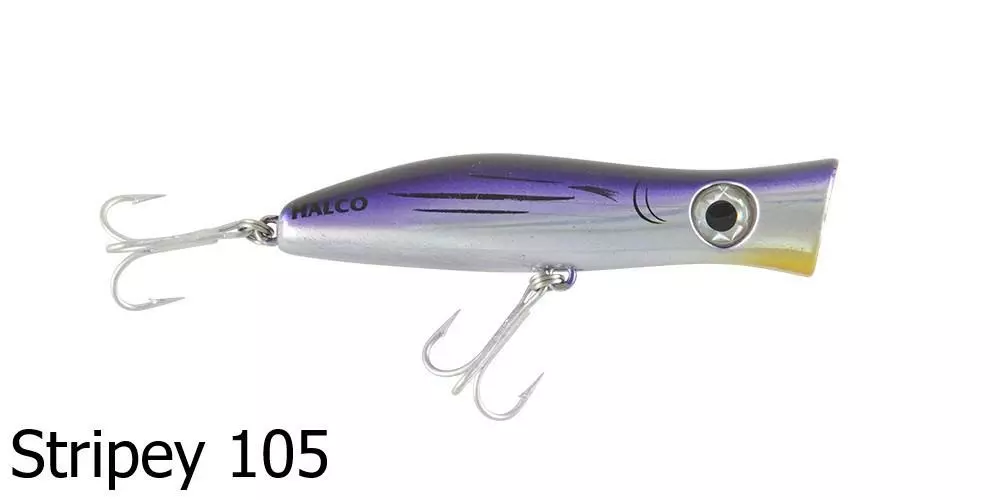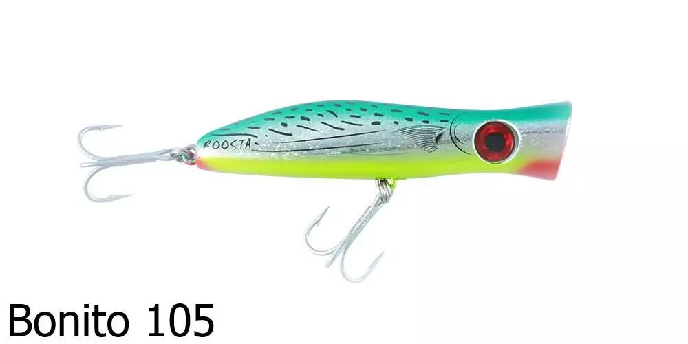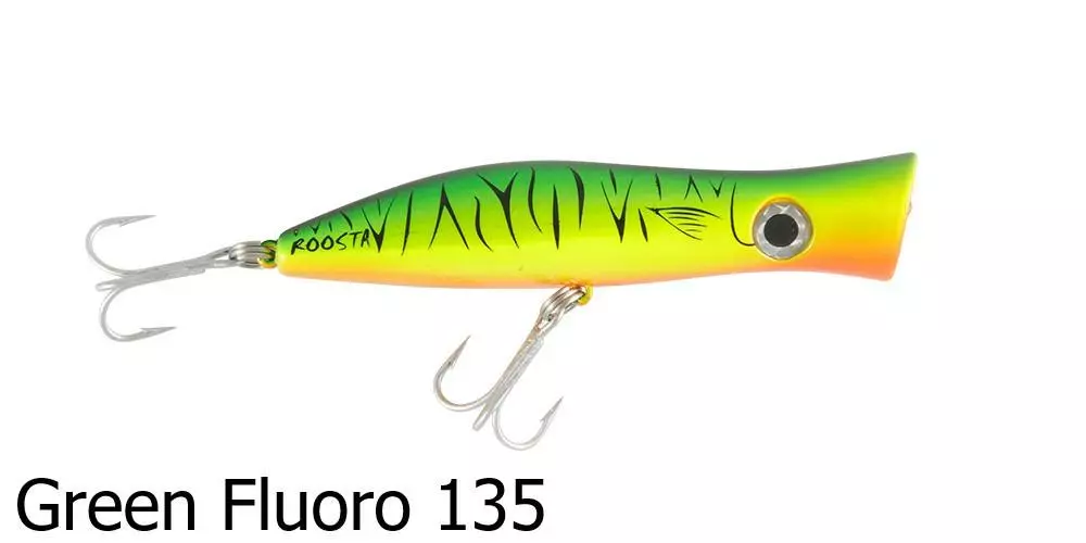 The Halco Roosta Popper 105 Lure is a surface popper and blooper. Catch big salt water fish with this surface popping lure as it splashes about attracting nearby fish. By changing the height of your rod tip, you are able to change how the lure responds and swims underwater – a rod tip closer to the water surface produces a stronger bubble action and is ideal in rough conditions or strong winds.Â
