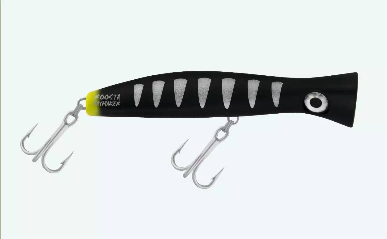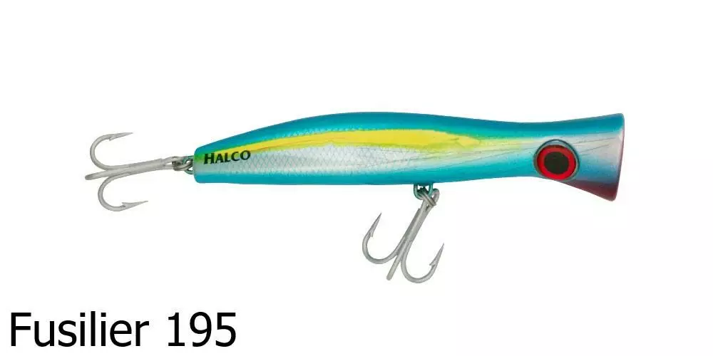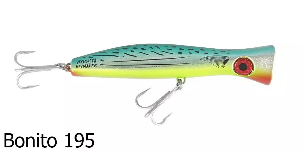 The Halco Roosta Popper 195 Haymaker is designed for catching some of the toughest fish that swim, from Giant Trevally to Dogtooth Tuna. It is built with extra heavy duty, custom made 7xx fish rings and is equipped with Mustad 5 extra strong 5/0 trebles.
