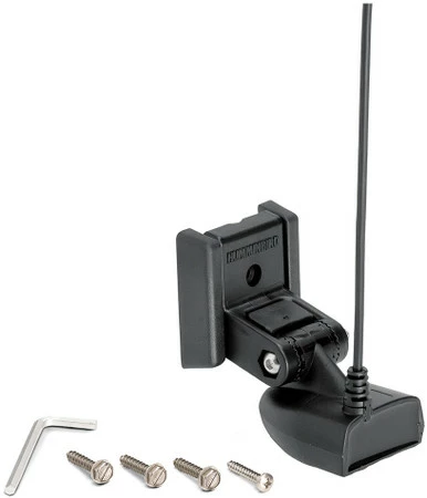 Transom Mount Dual Spectrum CHIRP Transducer supports Dual Spectrum CHIRP 2D Sonar with high frequency beam and wide cone angle, offering CHIRP range of 150-220kHz and max depth of 1200ft. Includes built-in temperature sensor, rugged composite design, impact-release mounting bracket and 20′ cable.