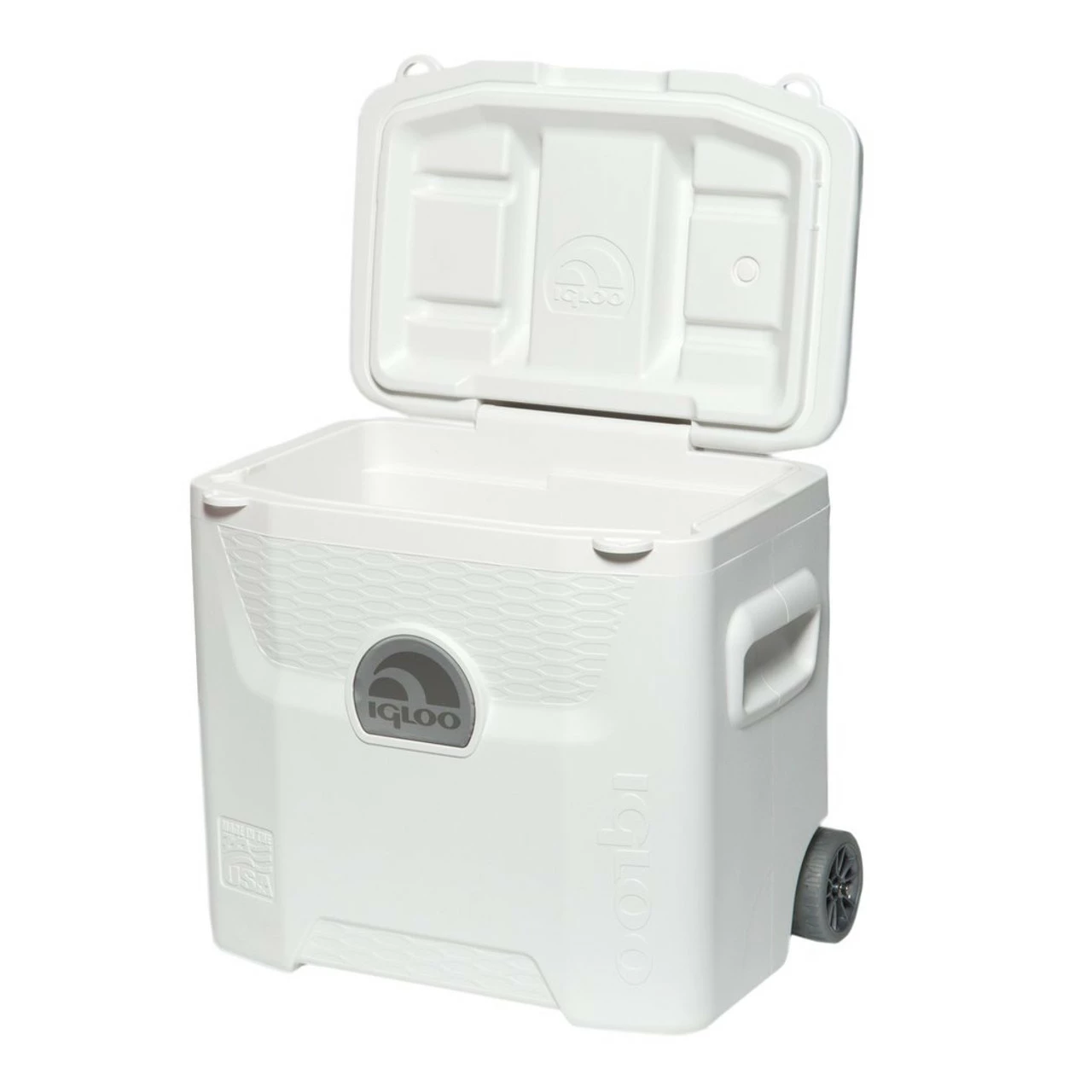 The Igloo Marine Ultra Quantum 28 Quart Roller Cooler utilizes UV inhibitors and infrared technology that protect the cooler against sun damage. This cooler features a locking, telescoping handle equipped with gear hangers to hold totes, bags, and more, plus, non-marking, soft ride rally wheels for easy transport and a smooth ride. Cool Riser Technology improves cooling performance by elevating the cooler body from hot surfaces. Four self-draining cup holders have been built into the lid to keep your drinks secure and handy. Integrated pouring channels in the liner allow for easy purging of melted ice. The lockable lid loops used for maximum security also allow extra gear to be tied to the cooler for easy transport.