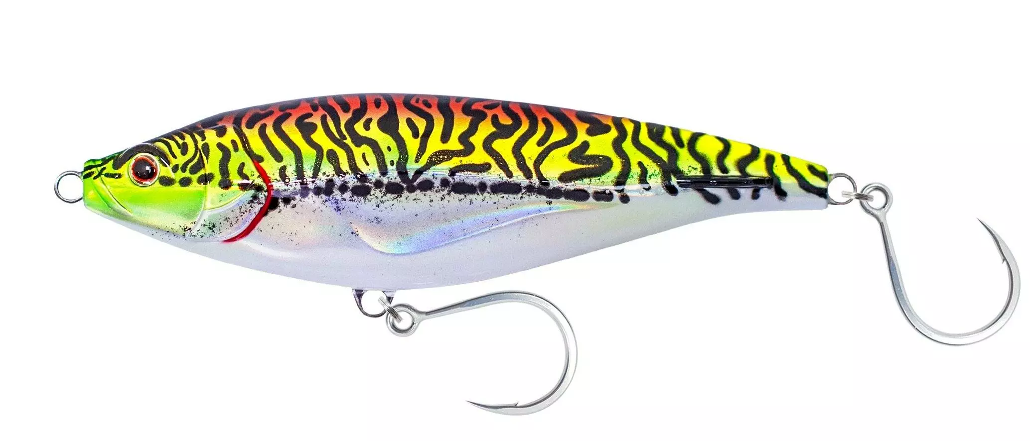 Madscad 150 is fitted with 2 x 4/0 BKK inline singles and heavy duty rings for the ultimate in strength. The Madscad shows its diverse ability with all 150 and 190 sizes able to be trolled, and the 190deep trolling at over 12kn makes it a super enticing wahoo or tuna lure. Whether it is GTs, Kingfish, tuna or mackerel when casting, or trolling for wahoo, tuna, marlin or sailfish, the Madscad can do it all. The all-round trolling and casting ability makes these sizes a must have for any serious bluewater fishing trip.