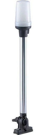 The Perko 1137DP0CHR Fold Down White All-Round Light features a vertical mount for flat or V-type center posts of windshield. Black plastic top. Anodized aluminum tube.