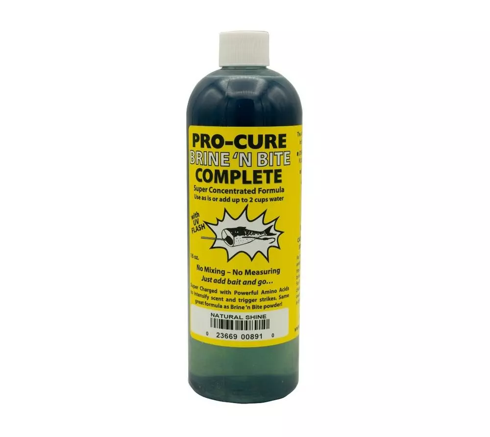 Available in Chartreuse Glow, with perfect amounts of dyes to give you brilliant, fluorescent coloured baits, or Natural Shine, with Bait Brite, designed to enhance the natural shine and glow of your baits, both with UV added. Brine ‘N Bite Complete liquid also contains Pro-Cure’s proprietary blend of amino acids to attract fish and trigger aggressive strikes.