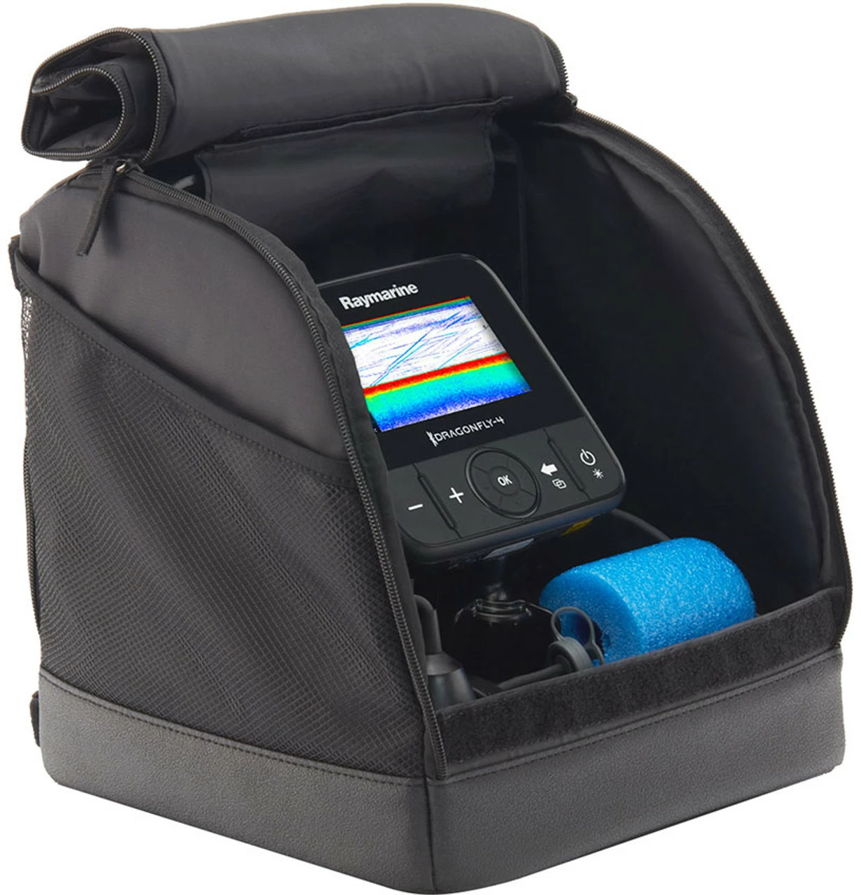 The Raymarine A80580 Dragonfly Ice Fishing Kit transforms your Raymarine Dragonfly into the ultimate ice fishing machine. The kit includes everything that cold weather anglers need to unleash the power of Dragonfly sonar on the ice. This portable kit is built to withstand the elements, with a rugged base and waterproof bag designed specifically for the Dragonfly. This Raymarine Ice Fishing Kit houses a high-frequency CHIRP CPT-S ice fishing transducer with float, rechargeable battery, and charger. Integrated rod holders make it easy to travel with all your gear, and full-sized cargo pockets provide ample room for tackle. The Raymarine Ice Fishing Kit truly is an all-in-one portable fishing package.