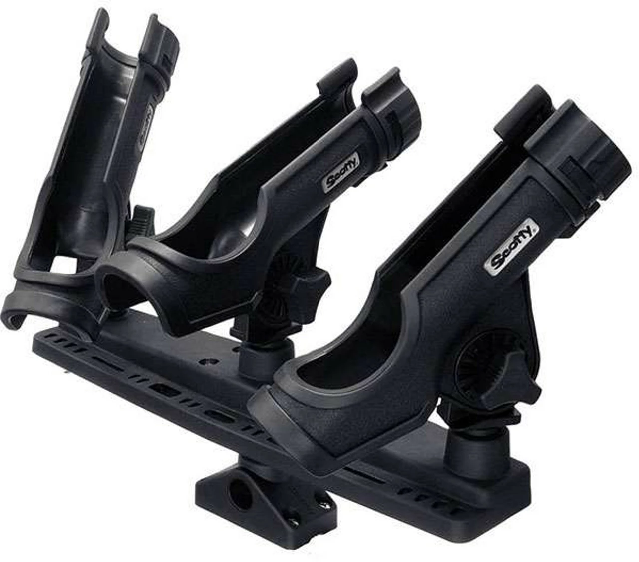Manufactured from super tough fiber reinforced engineering grade nylon, the Scotty Triple Rod Holder system is the best choice of anything on the market. It has a handy tool and lure rack to keep things organized and can swivel 360 degrees as well as each rod holder can swivel 360 degrees and tilt for ultimate versatility.