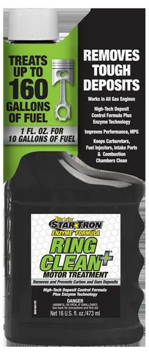 Star Brite Star Tron Ring Clean+ is formulated with the latest deposit control technology, plus a proprietary enzyme package that is designed to remove the toughest deposits while helping to prevent the formation of new deposits. Ring Clean+ removes deposits from carburetors, fuel injectors, intake ports, intake valves, and combustion chambers that can lead to stuck piston rings, engine knock, lost power, dirty spark plugs, reduced fuel efficiency, and decreased performance. Formulated to work in all boat, truck, car, motorcycle, and outdoor power equipment engines.
