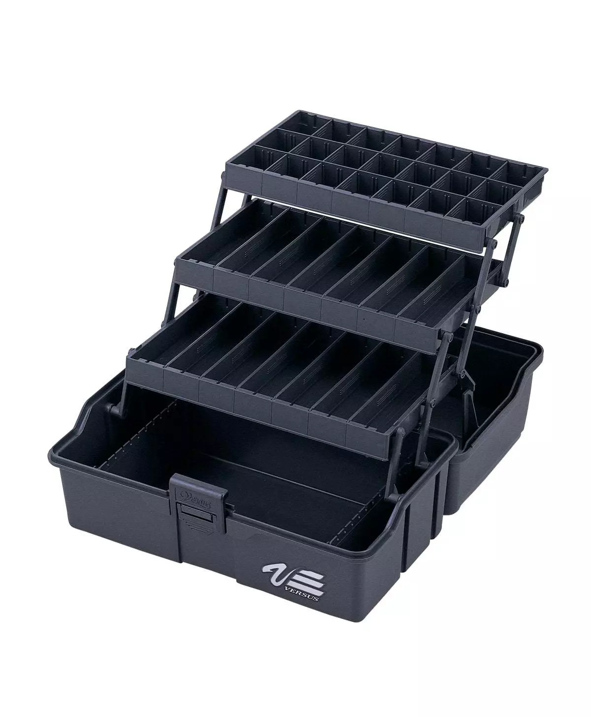 The Versus VS-7040 is premium plastic tackle box that is a must have for your next fishing trip. This large tackle box features three cantilever style trays for maximum storage possibilities. The top tray has two fixed rows and 18 small removable dividers for varying compartment sizes. The next two tray tiers have 6 removable plastic dividers to make custom compartment sizes to fit any sized fishing tackle. The base of the tackle box also has 2 removable dividers with hooks slots for your large lures and rigs. Inside the lid is yet another storage area with 3 built in compartments for a quick grab section. This hinged lid tackle box also has a secure plastic flip latch that keeps the lid shut during transportation and a comfortable carrying handle so you can get it to the boat as easily as possible.Â
